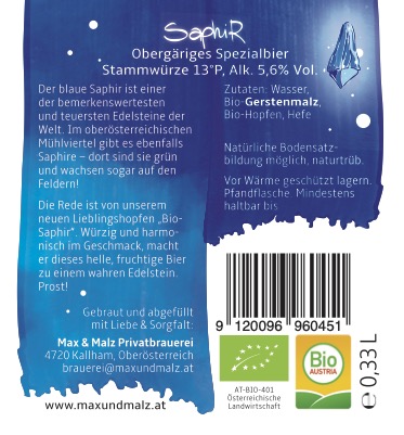 Hersteller: Max & Malz Privatbrauerei, Maximilian MeindlEinheit: 0,33 lDer blaue Saphir ist einer der bemerkenswertesten und teuersten Edelsteine der Welt.